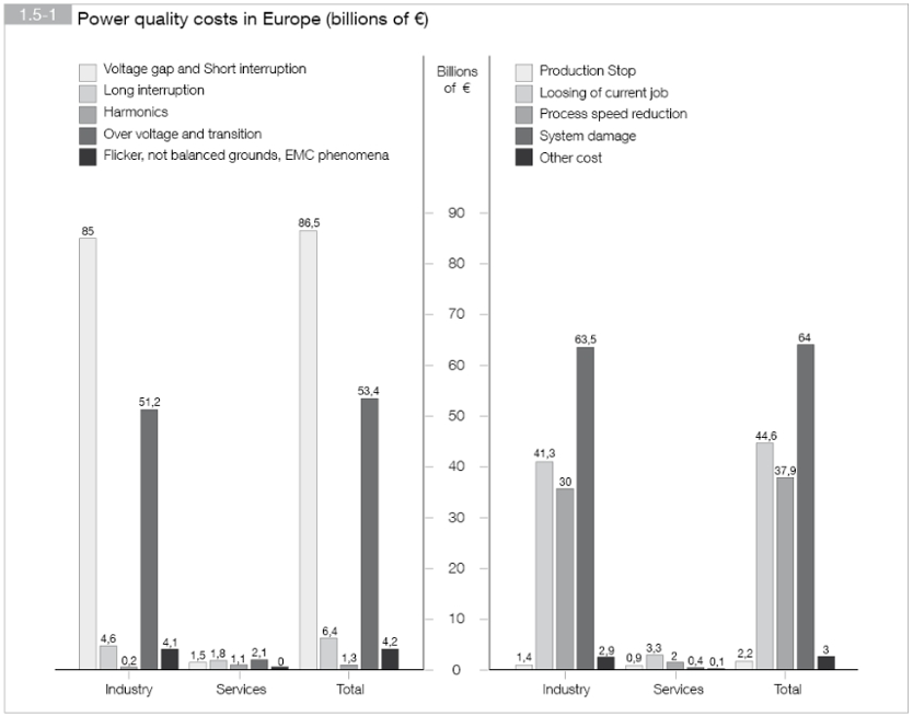A recent study[3] helps to evaluate the costs of low power quality. It highlights that more than 151 billion € are wasted in Europe every year, not only due to voltage dips and long interruption (61.2 %) but also due to overvoltage or transients in general (35.2 %), harmonics (<1 %) and flicker, and EMC problems (<1 %).