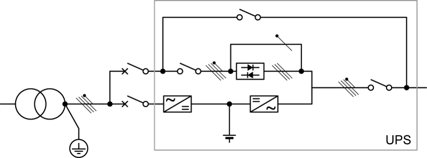 The plant neutral is usually distributed downstream the UPS via bypass. Depending on national prescriptions 4-poles circuit breakers in PDUs could be employed . This must be considered in case of TN-C neutral systems, since the standards do not allow any interruption of the earth conductor, but also for TN-S, since the plant portion downstream the UPS could get a temporary IT system. The situation is the same in case of 4-poles UPS bypass breaker or maintenance of UPSs without the proper external maintenance bypass.